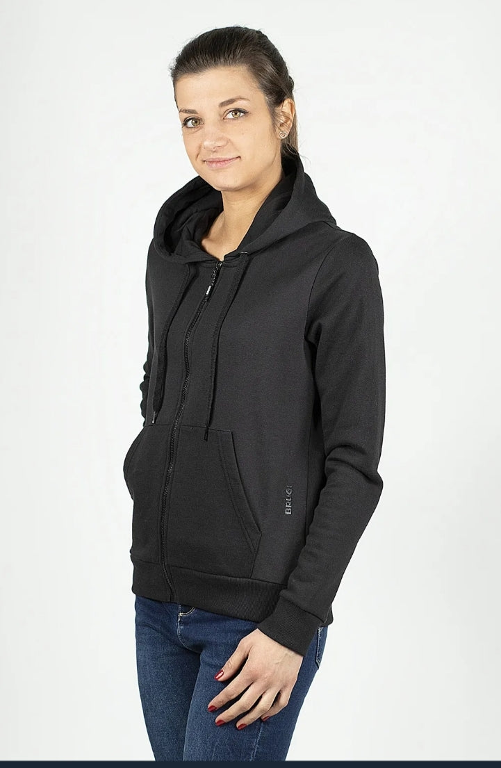 Felpa cappuccio con zip 100% cotone garzato internamente. ha tasche applicate, maglina ai polsi e sul fondo.