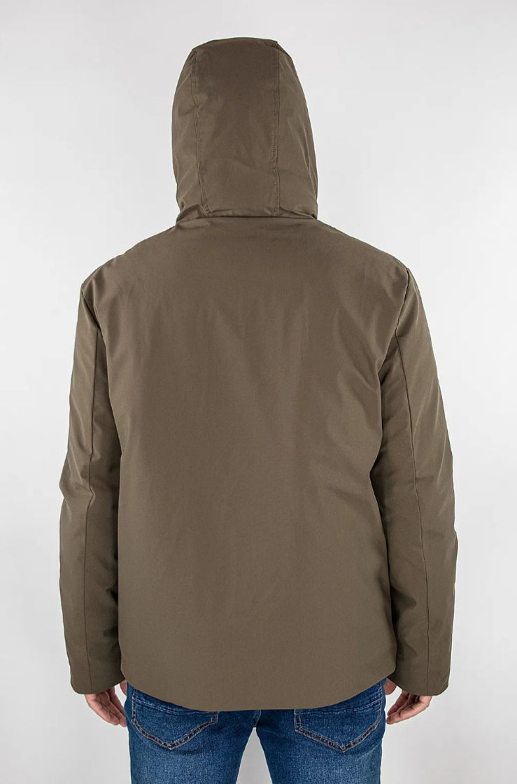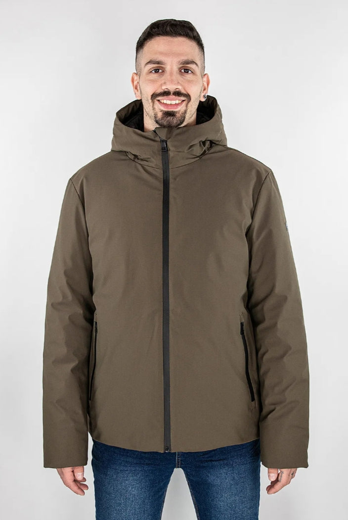 Giacca imbottita in softshell, cappuccio regolabile, apertura davanti e tasche laterali con zip nastrate, tasca interna multiuso, etichetta logo manica sinistra.