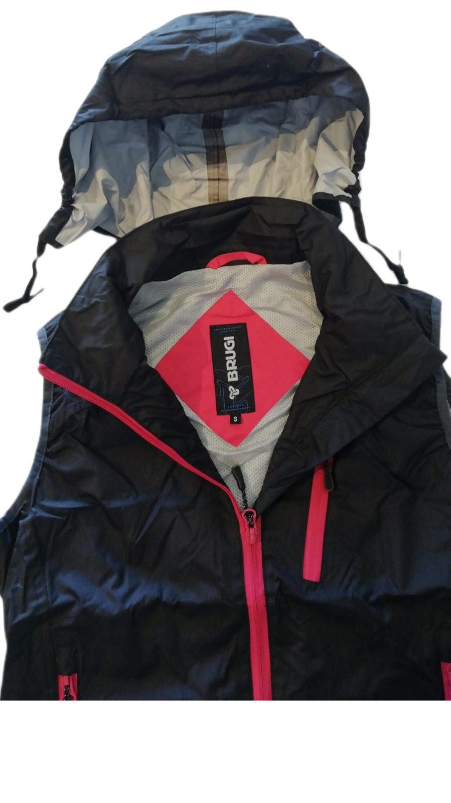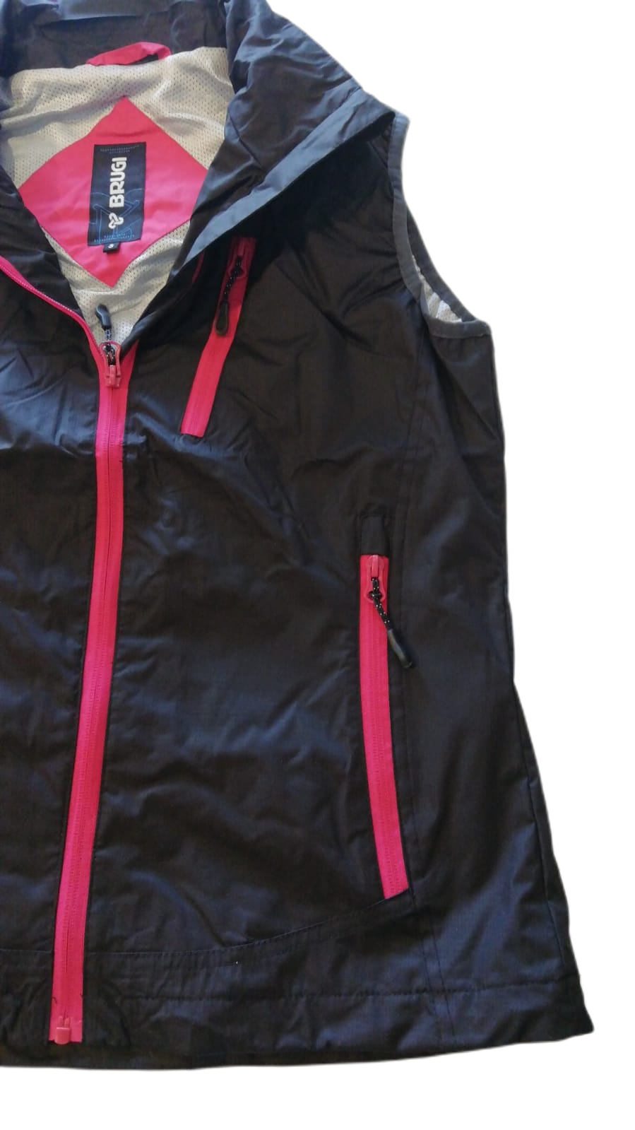 Gilet foderato in rete, chiusura con cerniera a vista nastro rovescio, cappuccio fisso richiudibile nel collo, giro manica bordato con elastico, due tasche davanti con cerniera a vista nastro rovescio, taschino interno applicato parte destra chiuso da velcro, fondo leggermente stondato con coulisse di regolazione interno.