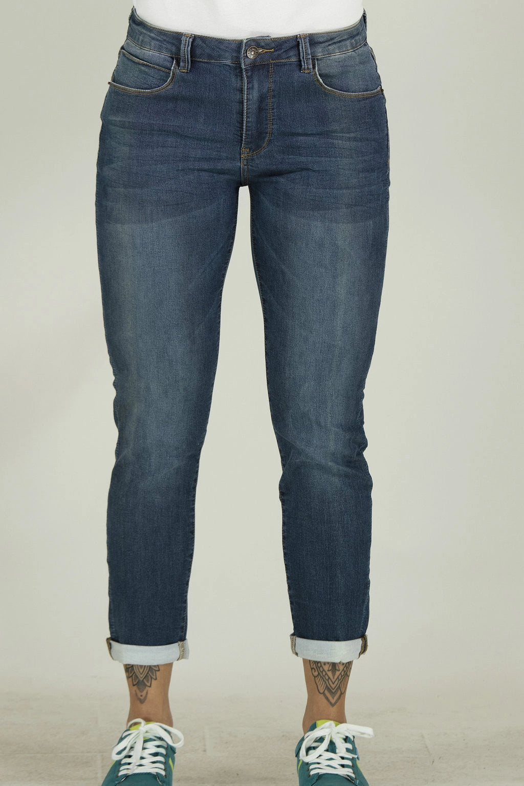 Pantaloni donna in morbido denim elasticizzato. peso 9 oz. con due tasche applicate dietro e due davanti. vestibilita' regolare. chiusura con zip e bottone. con ricamo sulle tasche dietro. lavaggio scuro con trattamento effetto usura.
