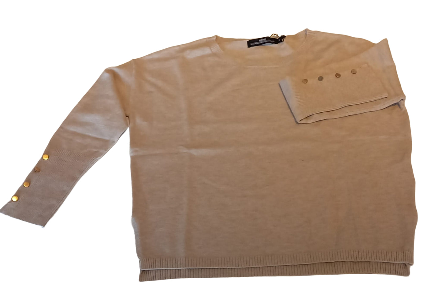 Maglia donna in morbido filato misto viscosa, caldo e confortevole, con scollo arrotondato. polsini alti con bottoni gioiello