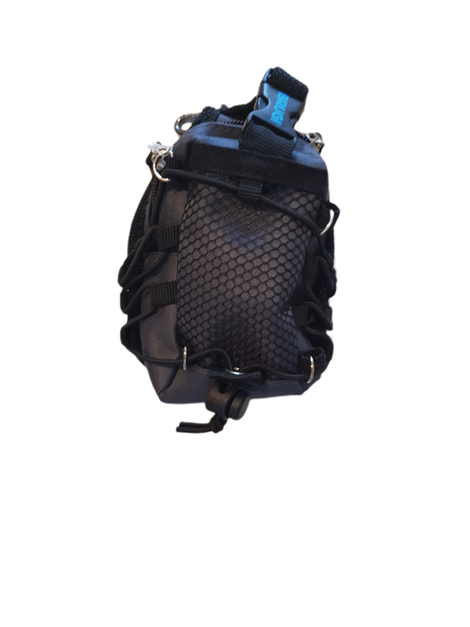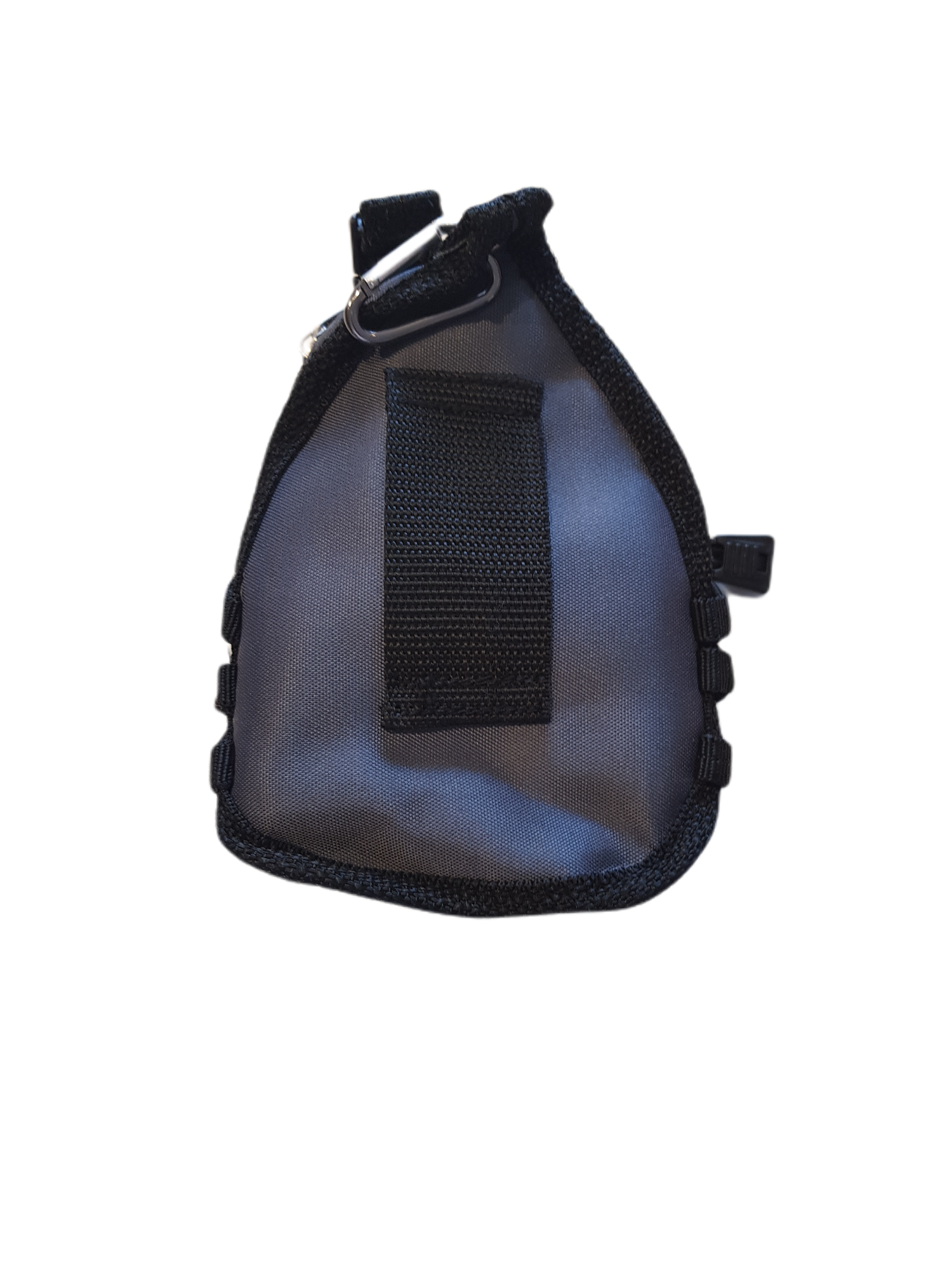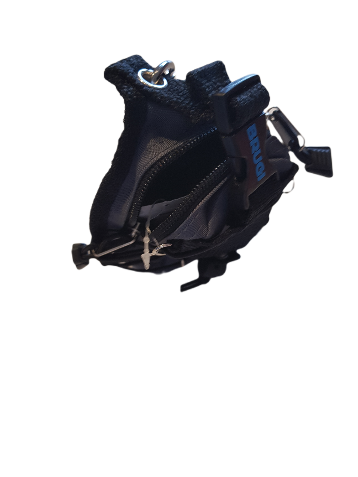 Borsello in tessuto Oxford con passante per portarlo in cintura e con moschettone, chiusura con zip, un taschino con rete all'interno e uno all'esterno.