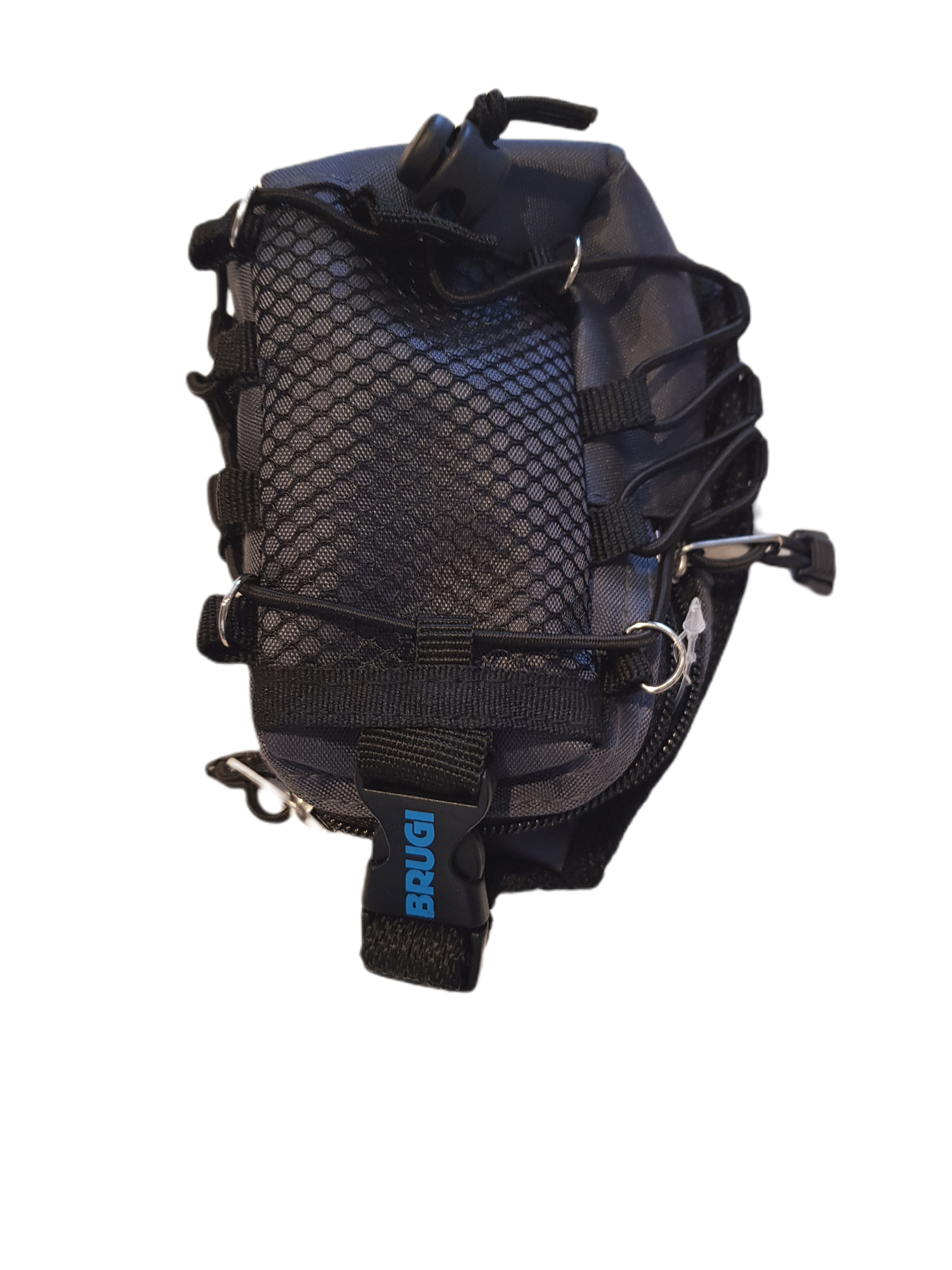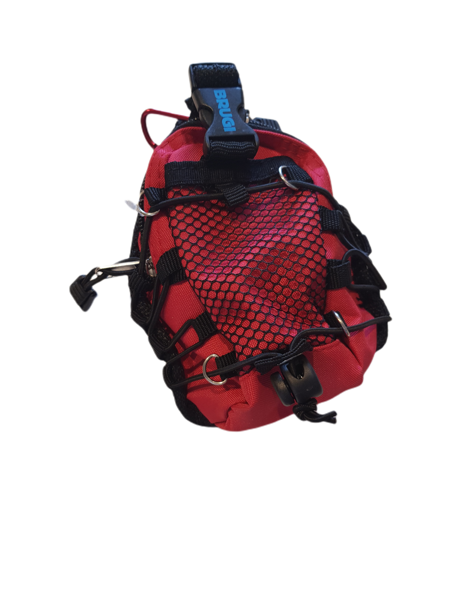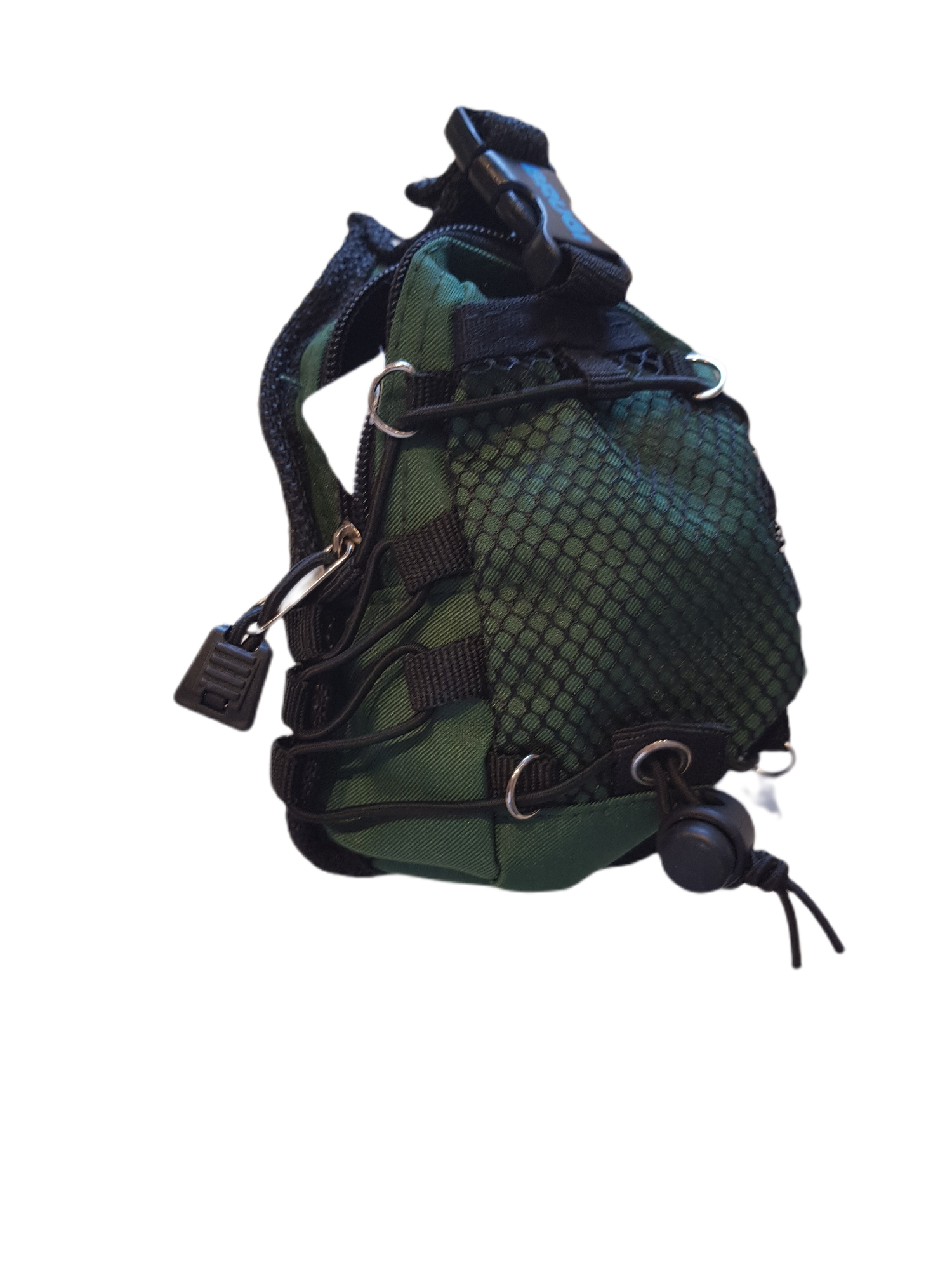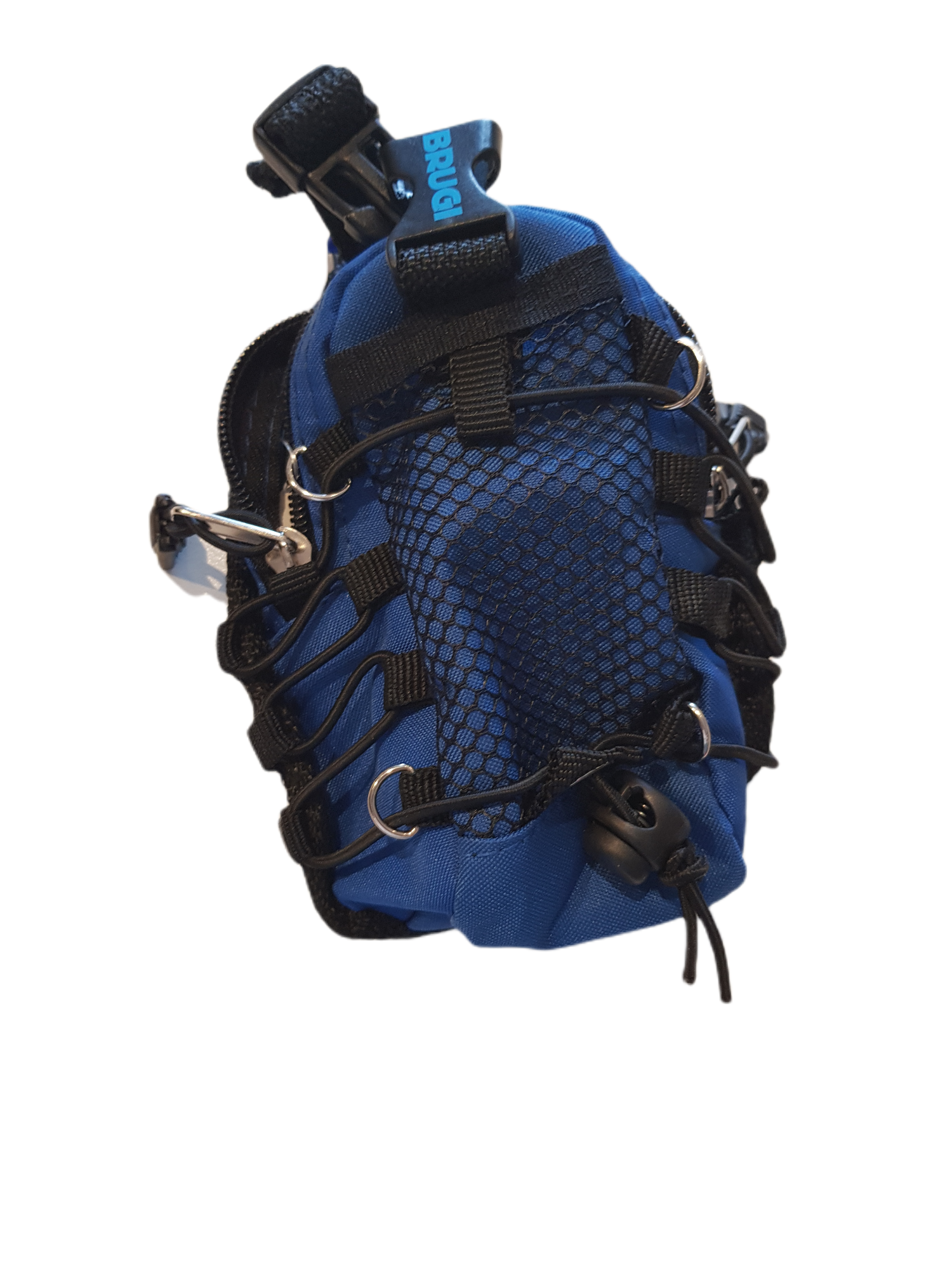 Borsello in tessuto Oxford con passante per portarlo in cintura e con moschettone, chiusura con zip, un taschino con rete all'interno e uno all'esterno.